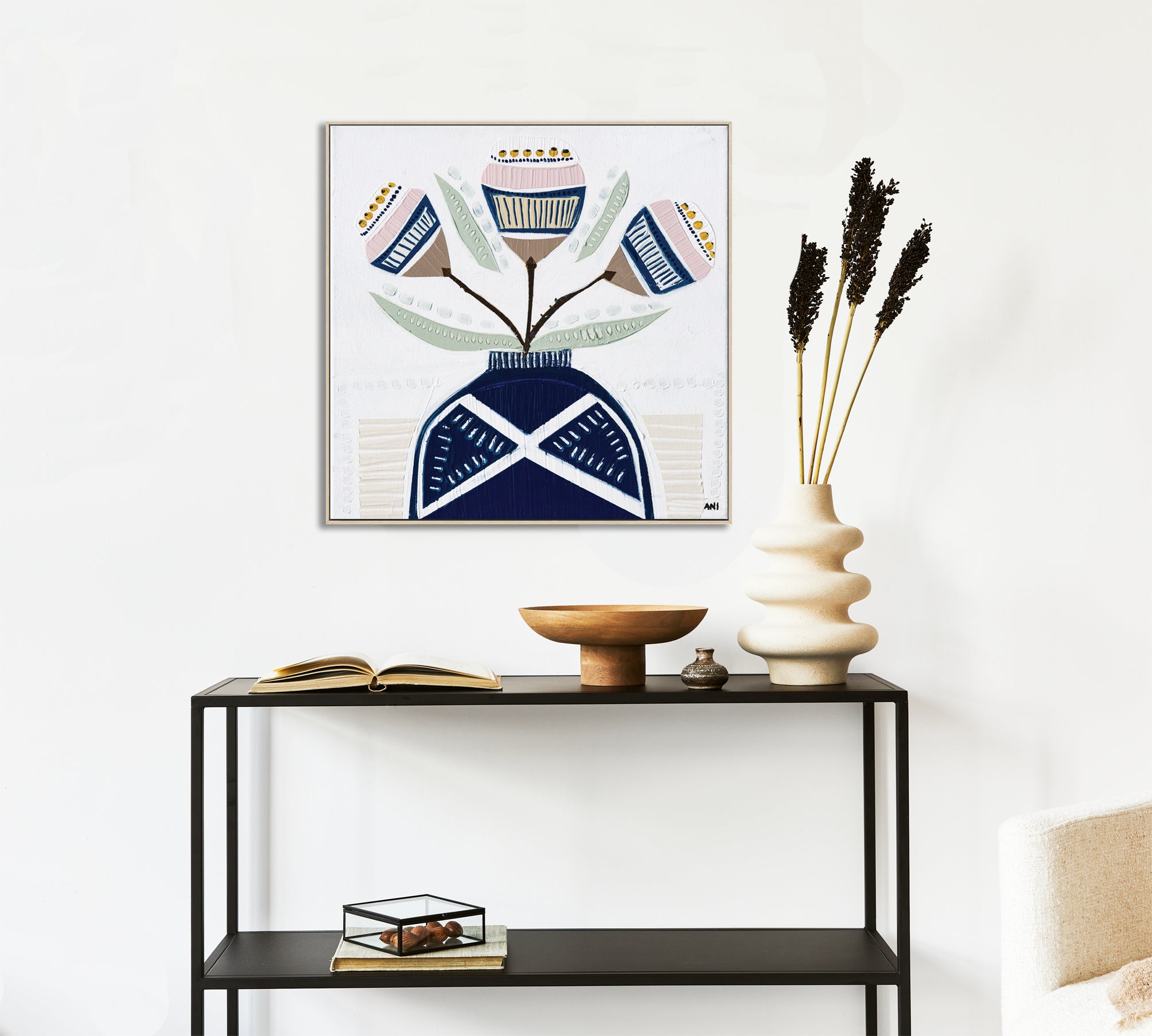 Ani Ipradjian, a Melbourne-based artist, is known for her unique asymmetrical abstract style inspired by nature and cityscapes. Her work, featuring luscious textures and vibrant colors, captures Australia’s native flora and landscapes. With a Diploma in Art and Design, Graphic Design, and Photography, Ani combines acrylic painting with mixed media. She predominantly uses soft pinks, calming blues, and warm mustards. Ani's art brings any room to life.