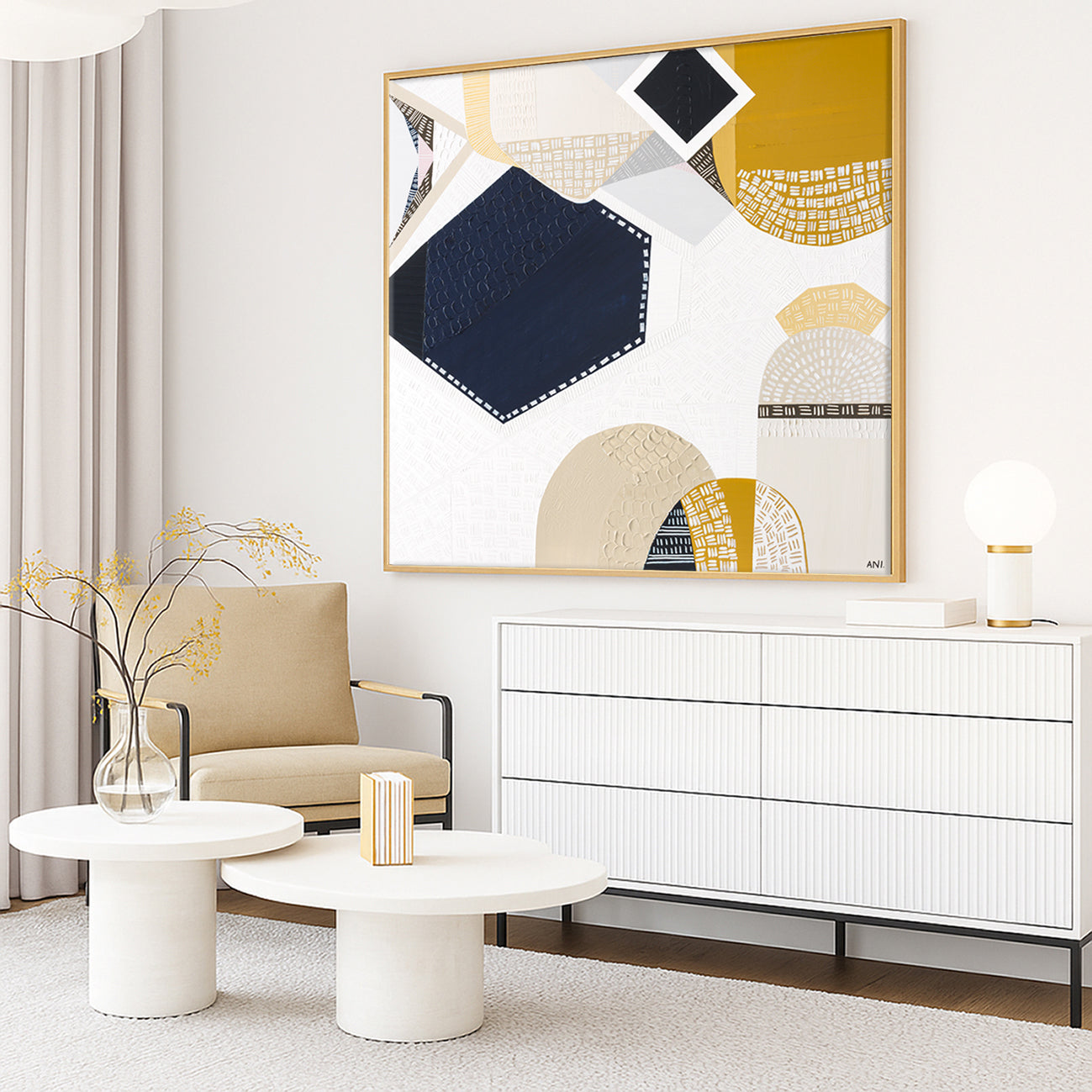 Featured in Grand Designs. Home Beautiful, home and Art Edit, and Herald Sun, her asymmetrical style captures Australia’s natural essence through acrylic and mixed media.