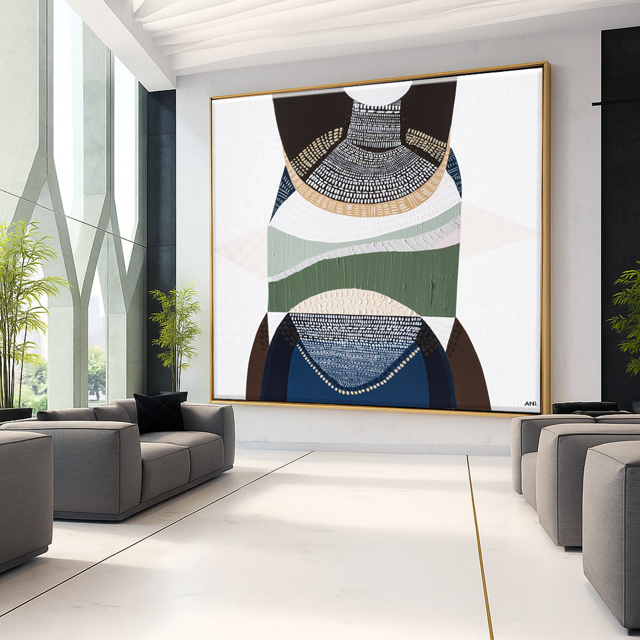 Featured in Grand Designs, Home Beautiful, Art Edit, and Herald Sun, her asymmetrical style captures Australia’s natural essence through acrylic and mixed media.