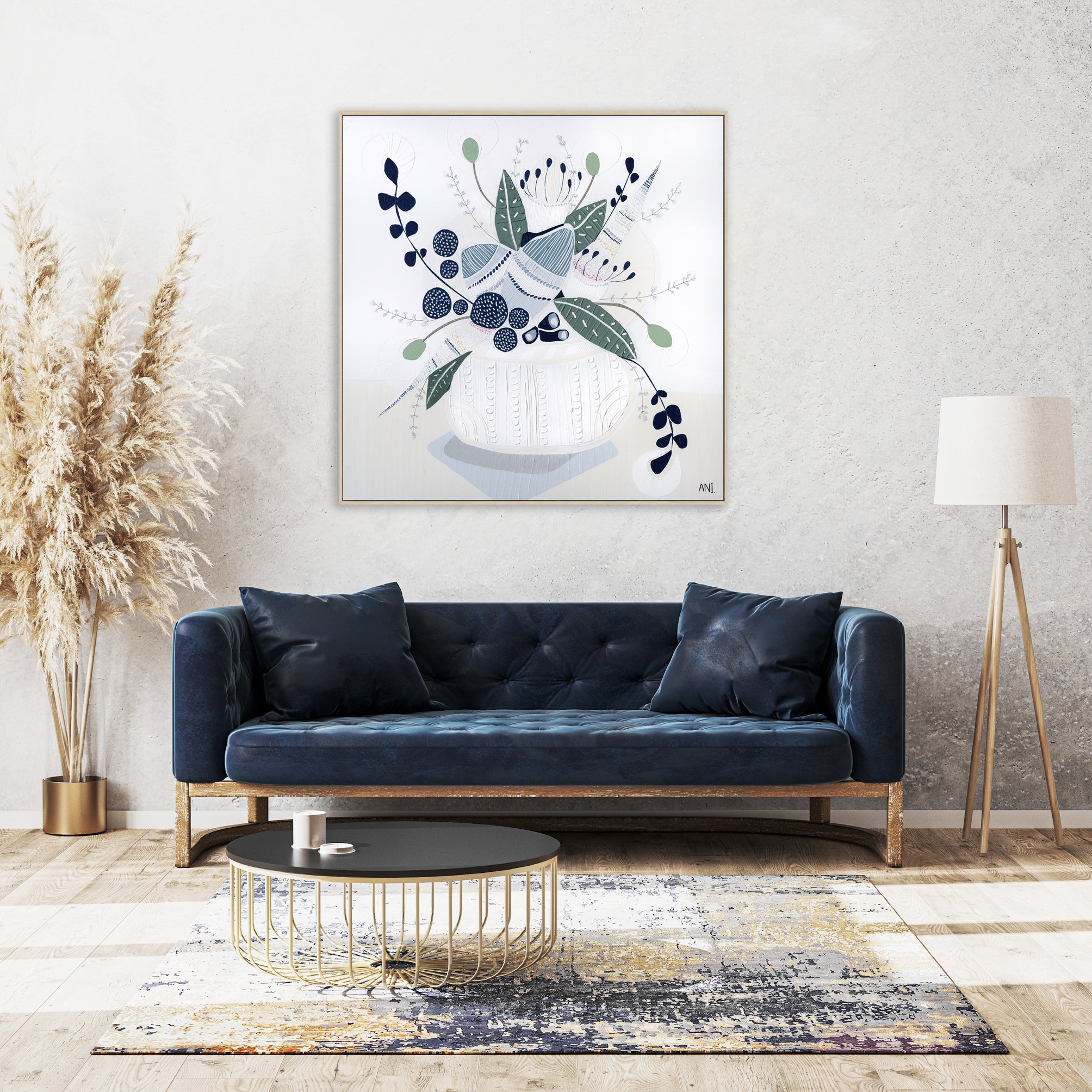 The Hamptons Bouquet captures the unique charm and essence of the coastal Hamptons region. Featuring soft blues and greens, the painting evokes a feeling of tranquility and elegance that reflect the peaceful environment of the Hamptons. B