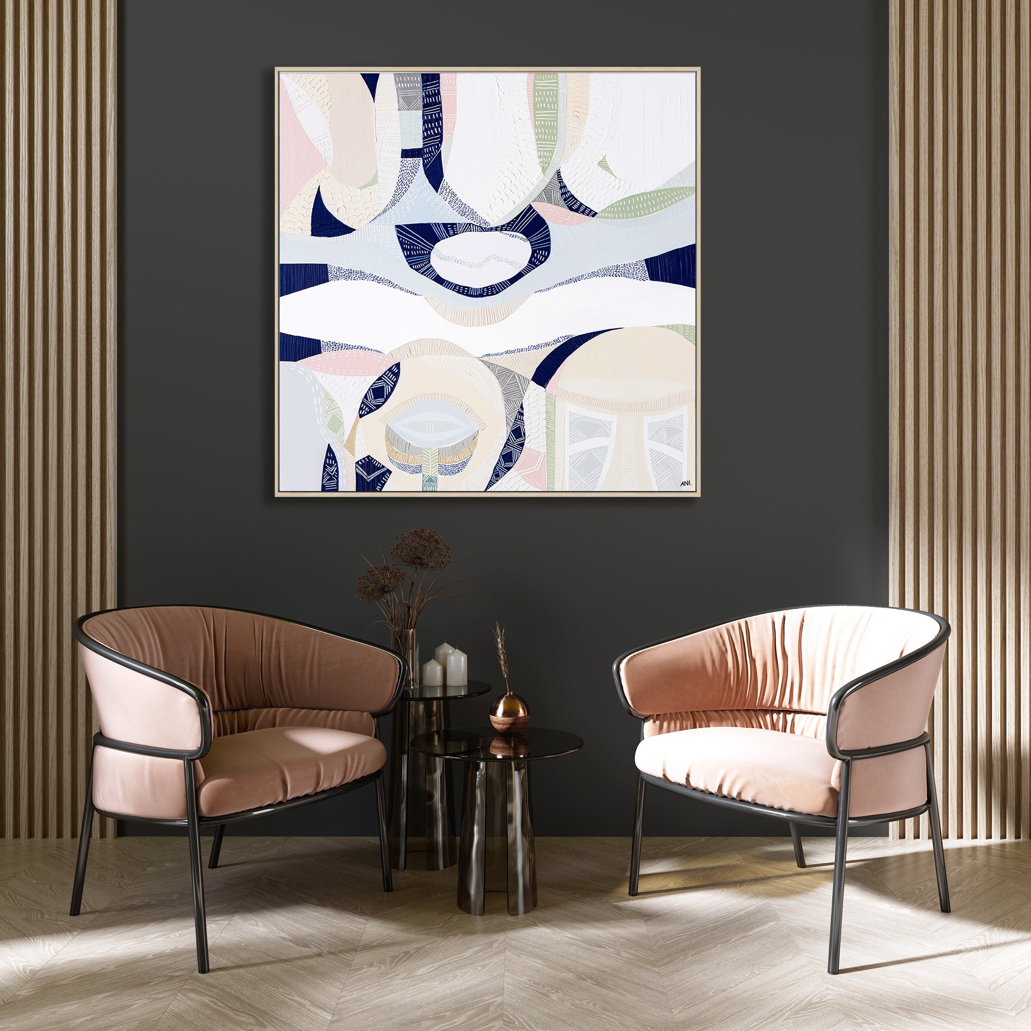 Ani Ipradjian, a Melbourne-based artist, is known for her unique asymmetrical abstract style inspired by nature and cityscapes. Her work, featuring luscious textures and vibrant colors, captures Australia’s native flora and landscapes. With a Diploma in Art and Design, Graphic Design, and Photography, Ani combines acrylic painting with mixed media. She predominantly uses soft pinks, calming blues, and warm mustards. Ani's art brings any room to life.