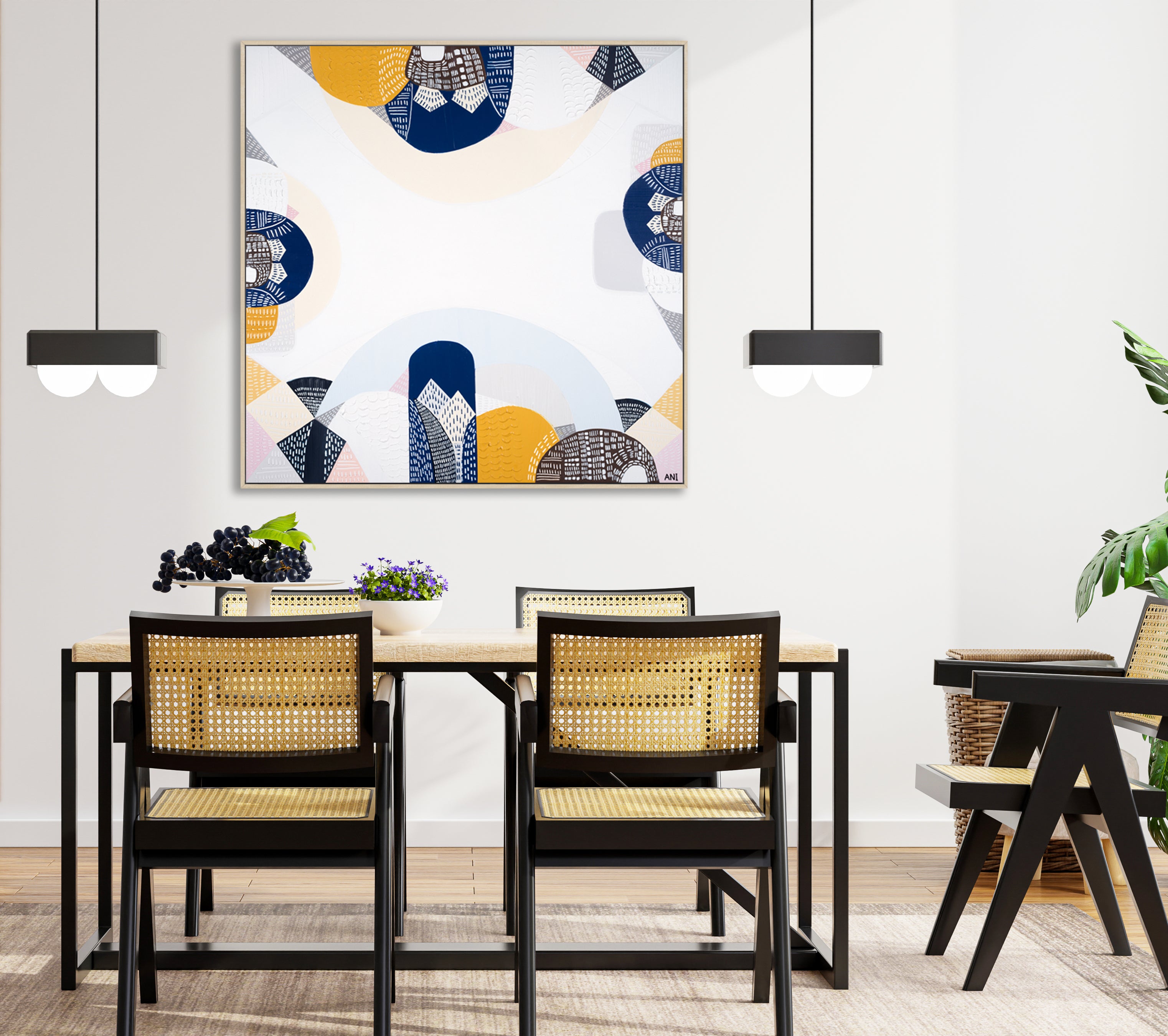 The blue gold, pink and mustard tones really work well together.
